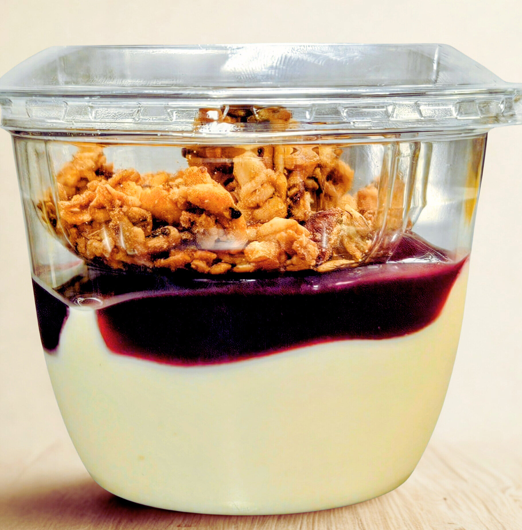 Een beker gevuld met smeuïge yoghurt, fruitcoulis (deze is steeds een creatie van het moment) en kraakverse, zelfgemaakte granola!